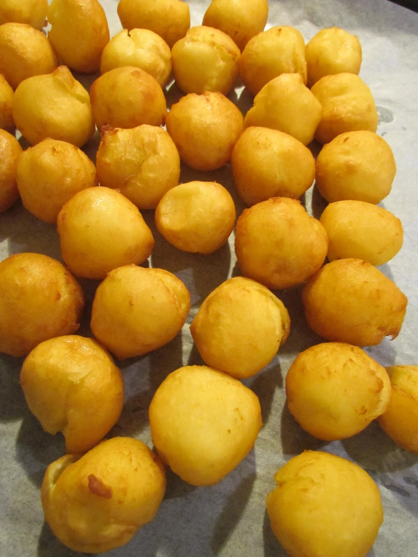 Formez de petites boules d’environ 3 cm diamètre à l’aide de cuillères à café ou d’une cuillère à pomme parisienne. Déposez-les sur du papier sulfurisé et répétez jusqu’à épuisement de la pâte.
