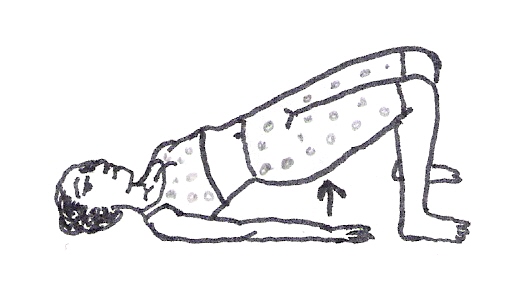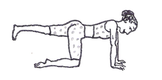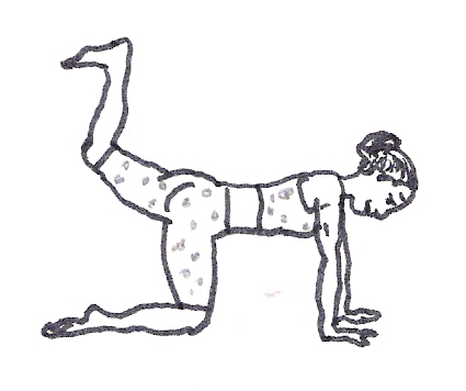 Position de départ : Position à quatre pattes, bras fléchis en appui sur les coudes, pas de dos cambré, ni relâché. La tête est dans le prolongement de la colonne vertébrale, le regard face au sol. Une jambe est fléchie à angle droit, pied fléchi, le talon dirigé vers le plafond.