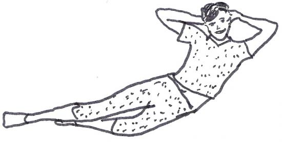 Position de départ : allongé sur le dos, les jambes fléchies pieds en contact, genoux écartés, mains derrière la tête.