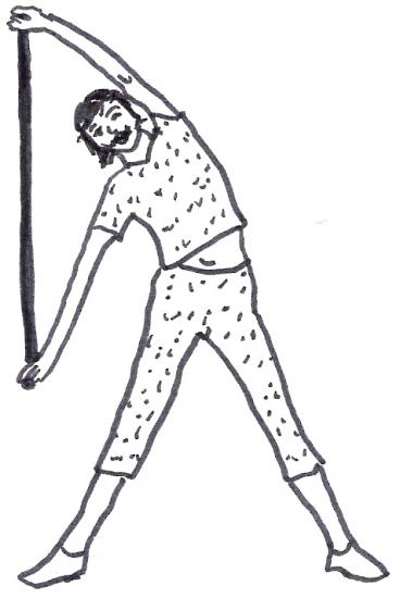 Position de départ : Debout, jambes écartées, bras tendus, un bâton au-dessus de la tête, biceps collés aux oreilles.